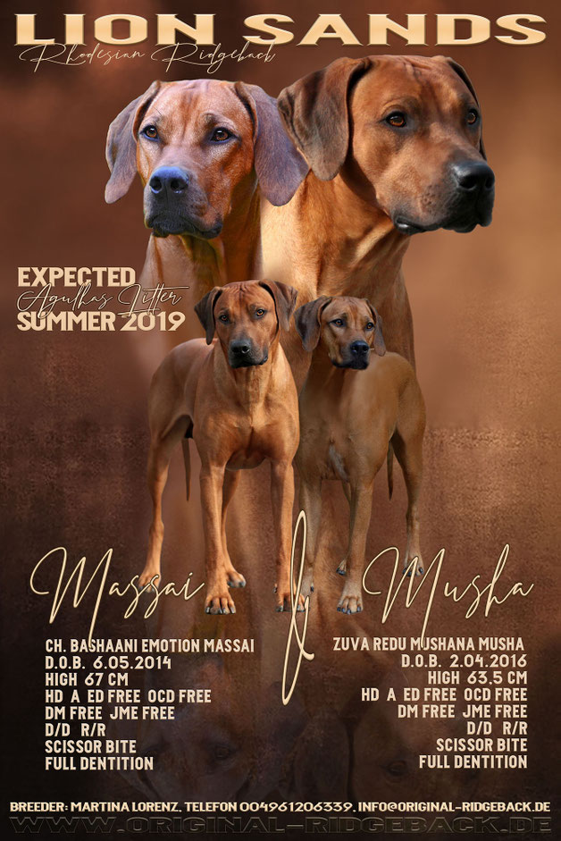 If you are interested in a small Lion Sands puppy, please contact me in reasonable time. Shane, Musha and of course I would like to get to know you as early as possible. We are looking forward to